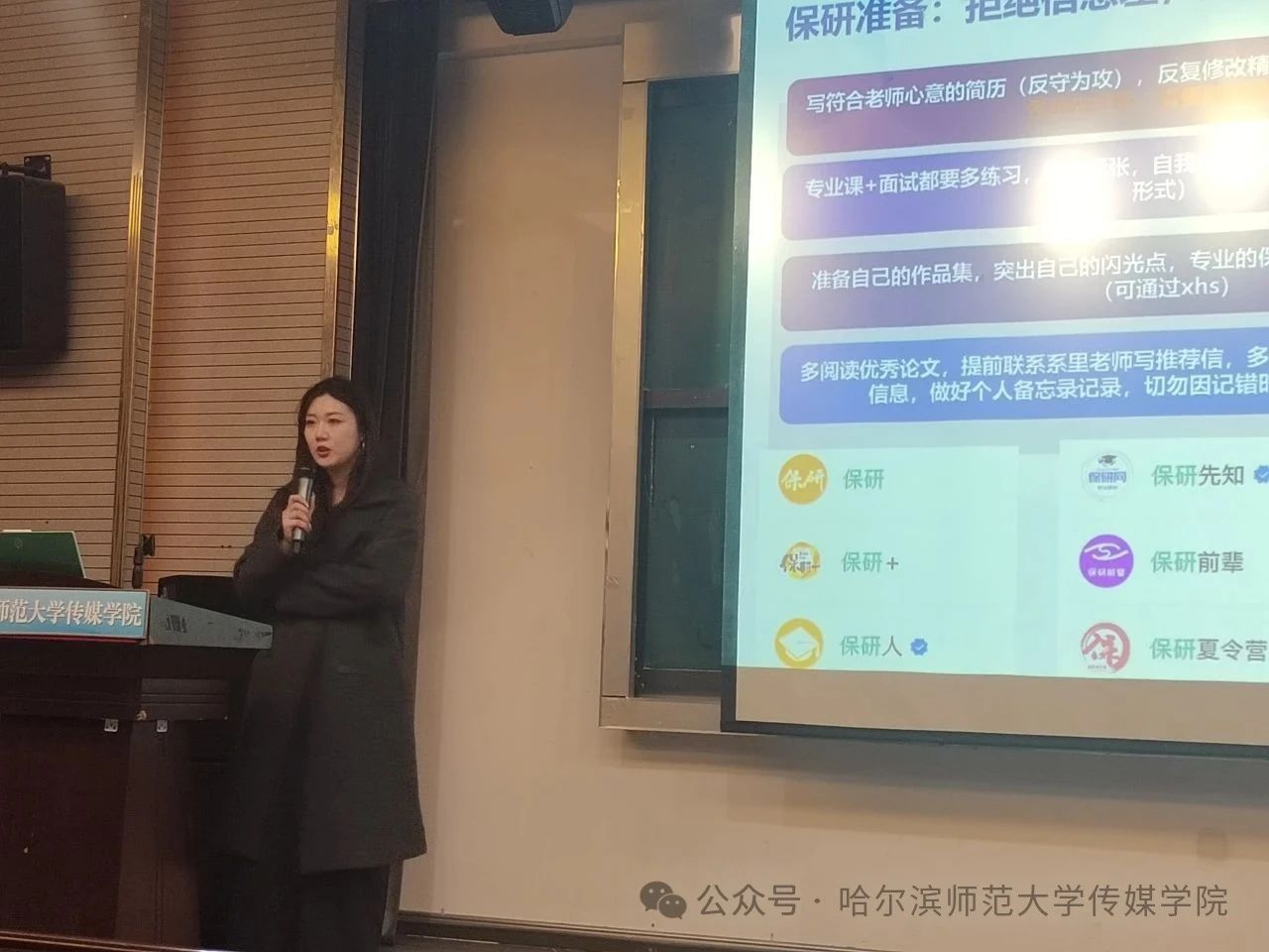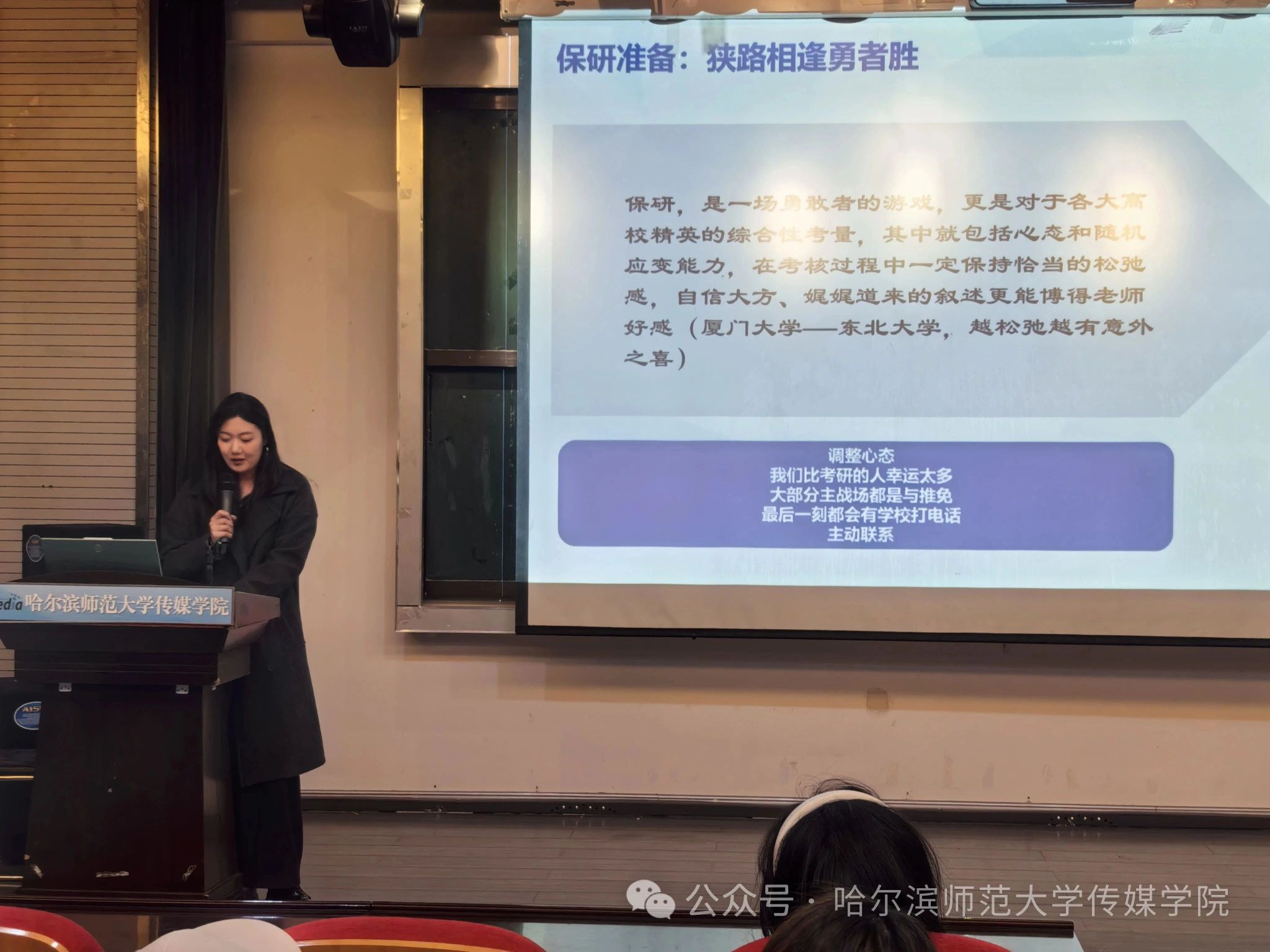 活动伊始,主持人为我们介绍了本次活动目的以及分享嘉宾,她们分别是保研于东北师范大学的齐小萌学姐以及保研于中央民族大学的李梓涵学姐。齐小萌学姐结合了自己的大学生活经历与学习经验,为我院同学们分享了自己的经验,加深同学们对于考研保研的理解。