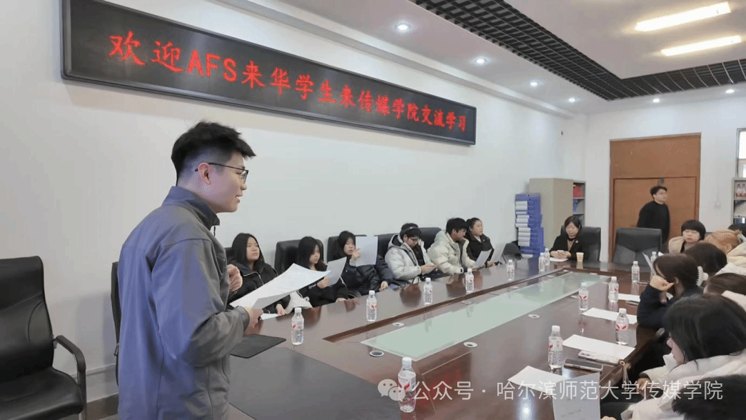 诵读声落,中心老师抓住这一温馨时刻,对AFS来华学生进行了校园采访。面对镜头,同学们兴奋地分享:“来哈尔滨这些天,我彻底爱上了东北菜!尤其是炖得软烂入味的排骨,还有外酥里嫩的锅包肉,酸甜咸香的味道太难忘了!”有的同学笑着谈起生活里的小惊喜:“来到中国后,我发现自己特别喜欢喝中国的茶,不管是清香的绿茶还是醇厚的红茶,淡淡的香气总能让人静下心来;而且我还跟着老师学会了写‘爱’字,这个汉字的结构特别温暖,就像中国人待人的态度一样,让人觉得亲切。”更有同学期待地说:“刚才观看的传媒学院作品太精彩了,让我看到了哈尔滨的不同面——有冰雪大世界的梦幻,也有中华巴洛克街区的复古,我已经迫不及待想在研学中去这些地方亲自走走,用相机记录下属于我的冰城记忆。”一句句真挚的表达,不仅记录下学子们的真实心声,更让这场跨文化交流的点滴感动得以留存。
