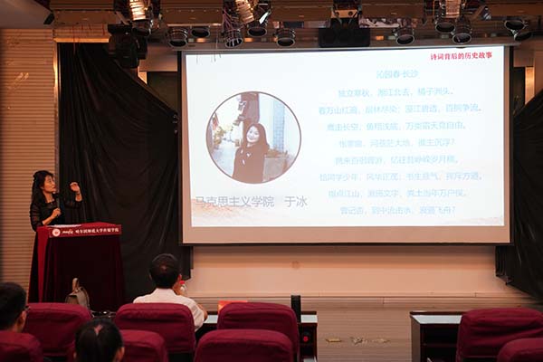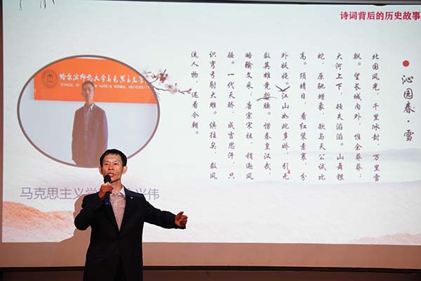 接下来,在学生党员杨康宁等的合诵《沁园春·雪》“俱往矣,数风流人物,还看今朝”的名句中,金兴伟老师走上台来为同学们讲解了《沁园春·雪》和《七律·人民解放军占领南京》两首诗词背后的历史故事。金老师的讲解意气风发,趣味横生。在他的讲述中,同学们被伟人毛泽东的气度、豪情以及他的斗争智慧深深折服。在讲解到《七律·人民解放军占领南京》时,金老师结合当前中美贸易战的时事,告诉同学们“天若有情天亦老,人间正道是沧桑”,中华民族伟大复兴的时代趋势不可阻挡,青年一代要有底气、明是非、担大任、建功业,“在改革开放的广阔天地中放飞青春梦想”。