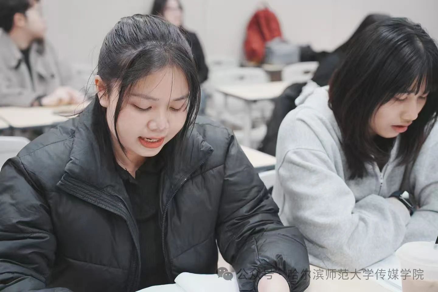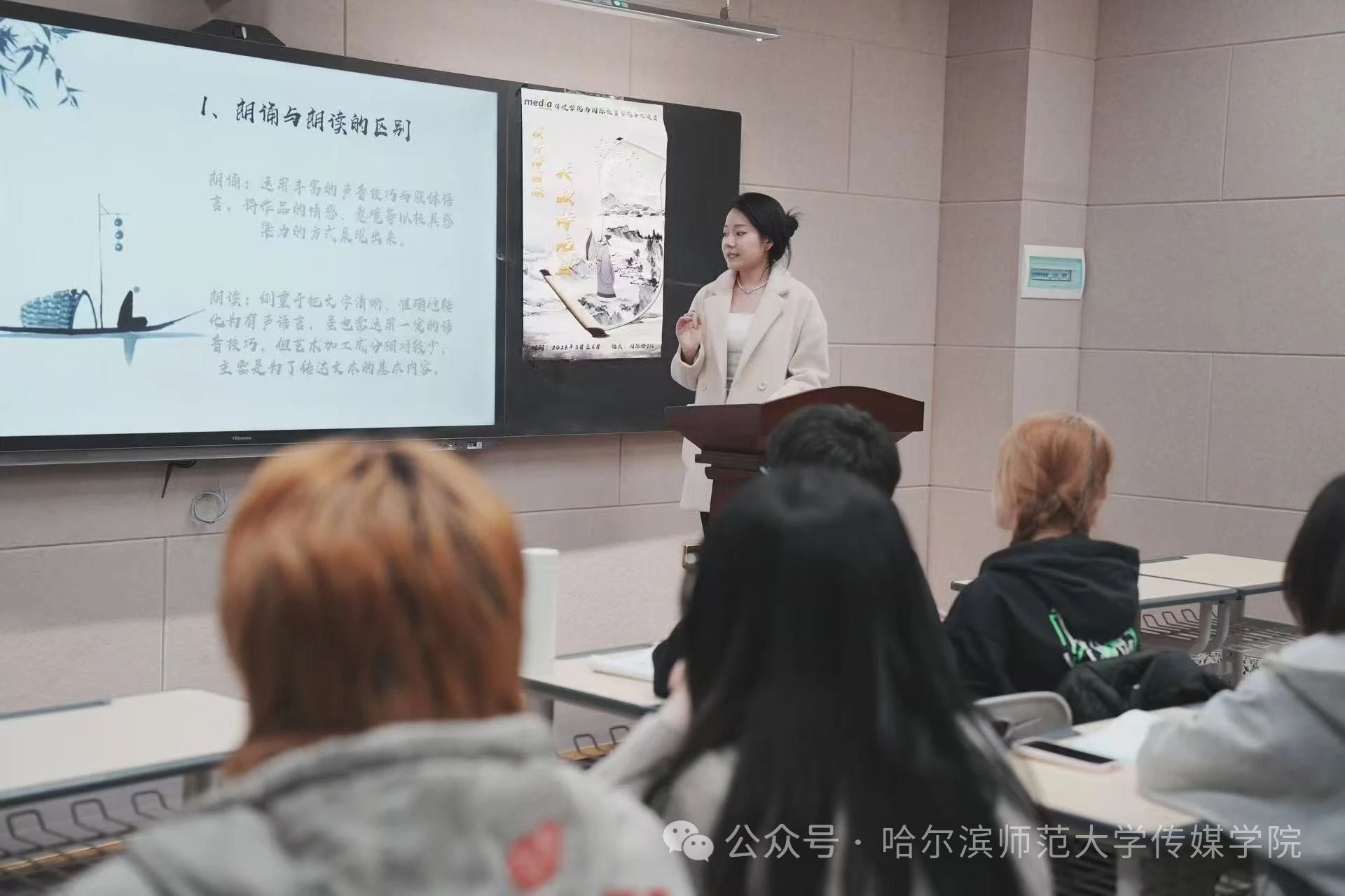 传媒学院2024级播音主持艺术专业李昀霏、车财嘉、代阳、薛佳彤4位同学组成朗诵团向来华留学生展示了诗朗诵《蒹葭》。代阳从随机提问中初步了解来华留学生的掌握情况,着重讲解朗读的四种音调并根据句义划分节奏,便于来华留学生掌握朗读技巧。在分组指导环节,来华留学生们学习态度积极,一字一句细读《蒹葭》,品味中国传统诗词的魅力。活动的最后,来华留学生们展示了学习成果,字正腔圆,声情并茂。
